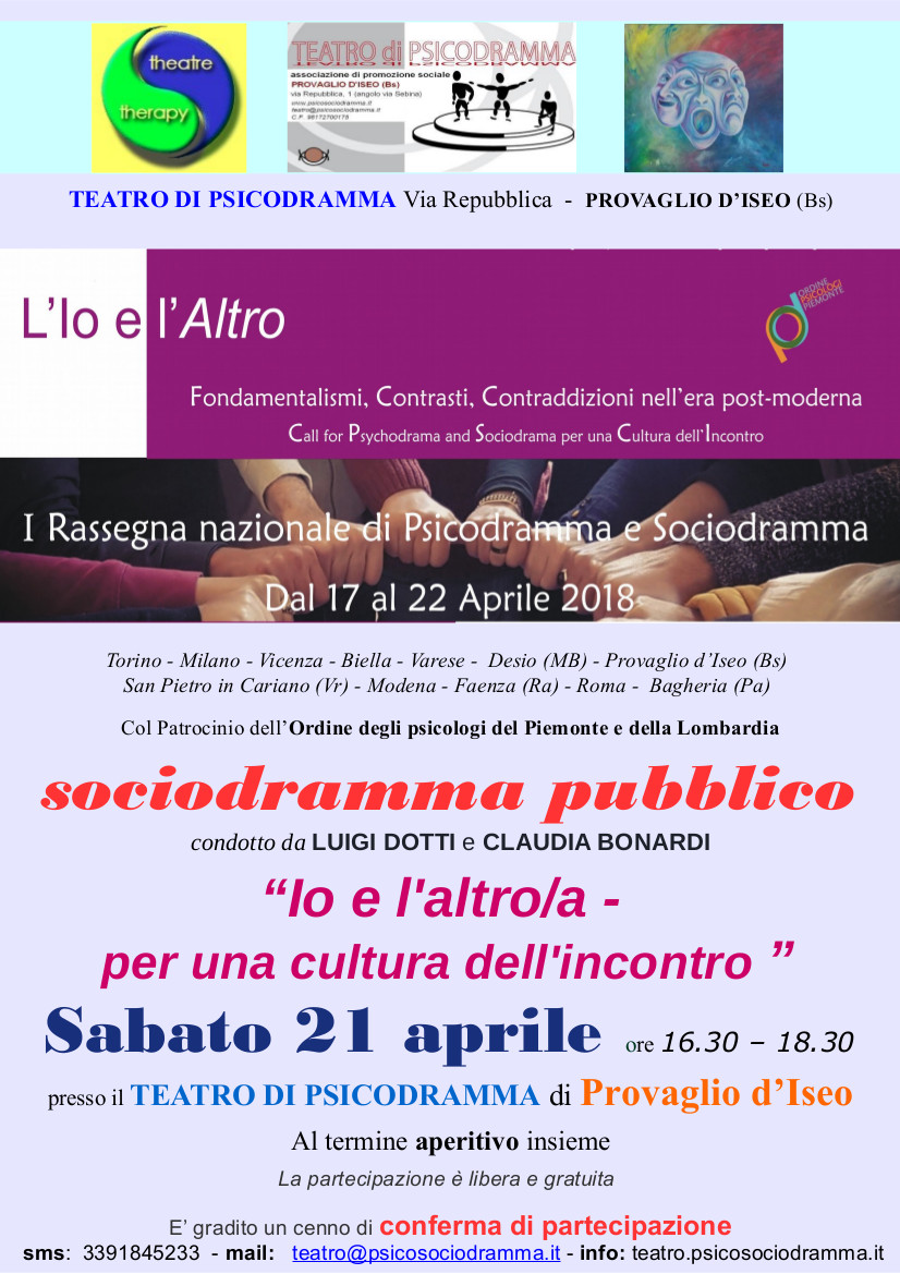 Piu' di quaranta psicologi, psicoterapeuti e psicodrammatisti che conducono gruppi in tante citta' d'Italia si sono dati appuntamento in simultanea dal 17 al 22 aprile per una settimana densa di eventi che fanno capo a un unico tema: L IO E L ALTRO - FONDAMENTALISMI, CONTRASTI, CONTRADDIZIONI NELL'ERA POST-MODERNA - CALL FOR PSYCHODRAMA AND SOCIODRAMA - PER UNA CULTURA DELL'INCONTRO.